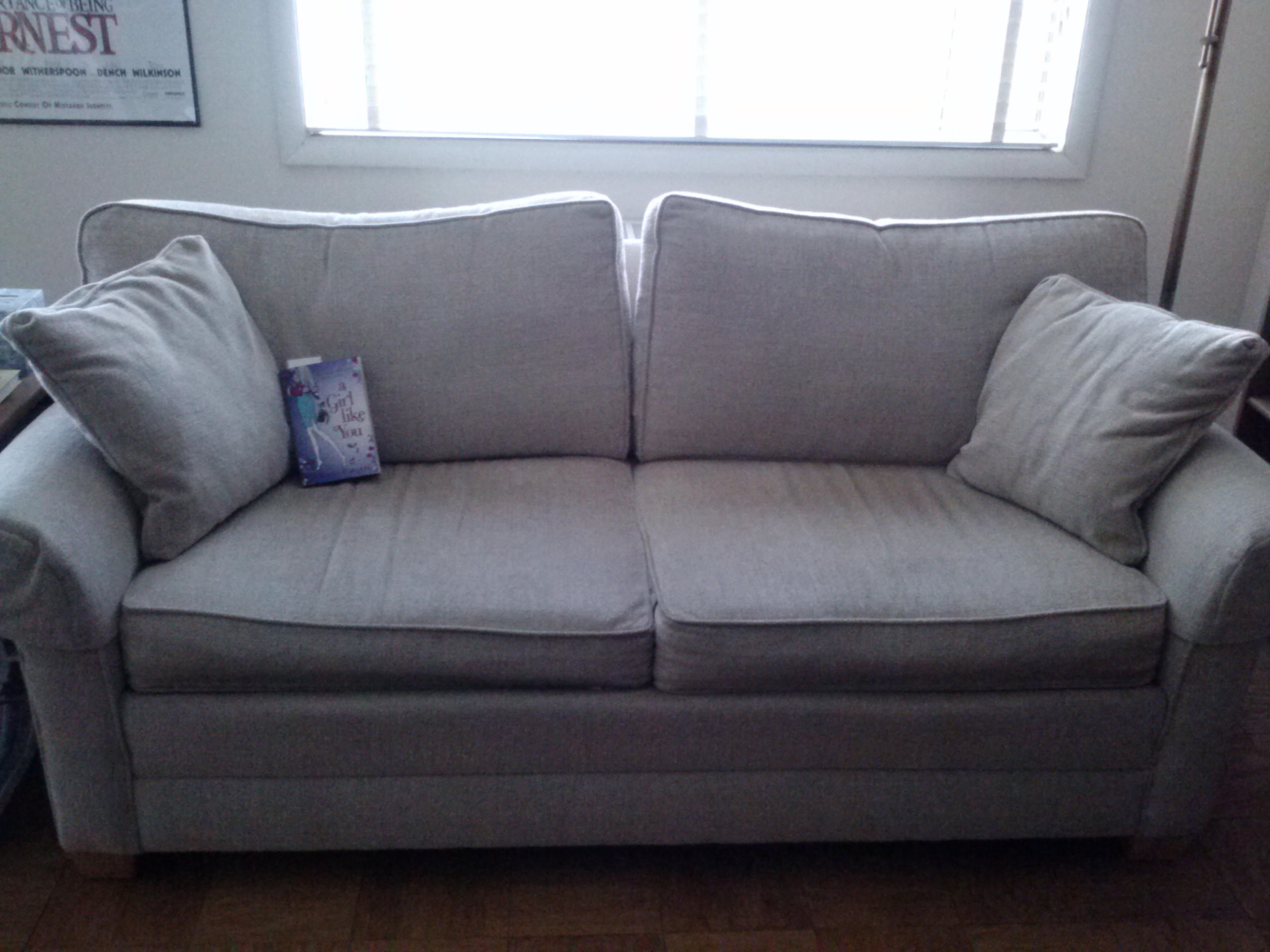 It is my couch, where I’ve been reading for most of the day (with occasional detours to my bed, plus my one foray outside). The book is nestled into the left corner. You can also see a bit of my “The Importance of Being Earnest” movie poster in the top left corner. (Why yes, that is how I chose to decorate my living room. Why do you ask?)