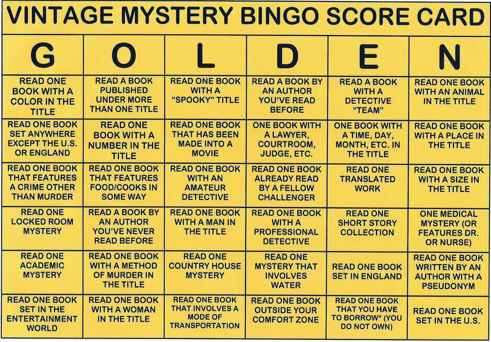 Participants were invited to play Bingo on either the Golden Age card (mysteries written pre-1960), the Silver Age card (mysteries written between 1960 and 1989), or both. Because of my other challenge commitments, I only attempted one straight-line Bingo, and I chose to use the Golden Age card: